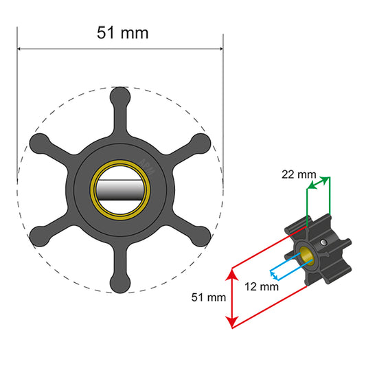 Albin Group Premium Impeller Kit - 51 x 12.7 x 22mm - 6 Blade - Key Insert [06-01-007]