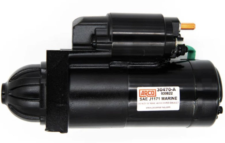 ARCO gear-reduction starter designed for Volvo Penta and Mercruiser engines with clockwise rotation and a 14" flywheel, featuring a durable black powder-coated finish.