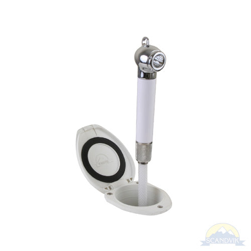 Fifth generation recessed showers. Improved UV protection, better water seal when cap is closed. Easy to use Push-Button or Euro trigger sprayer handles. Built-in grab ring for easy deployment. Mounts vertically or horizontally. Mounting hardware included.